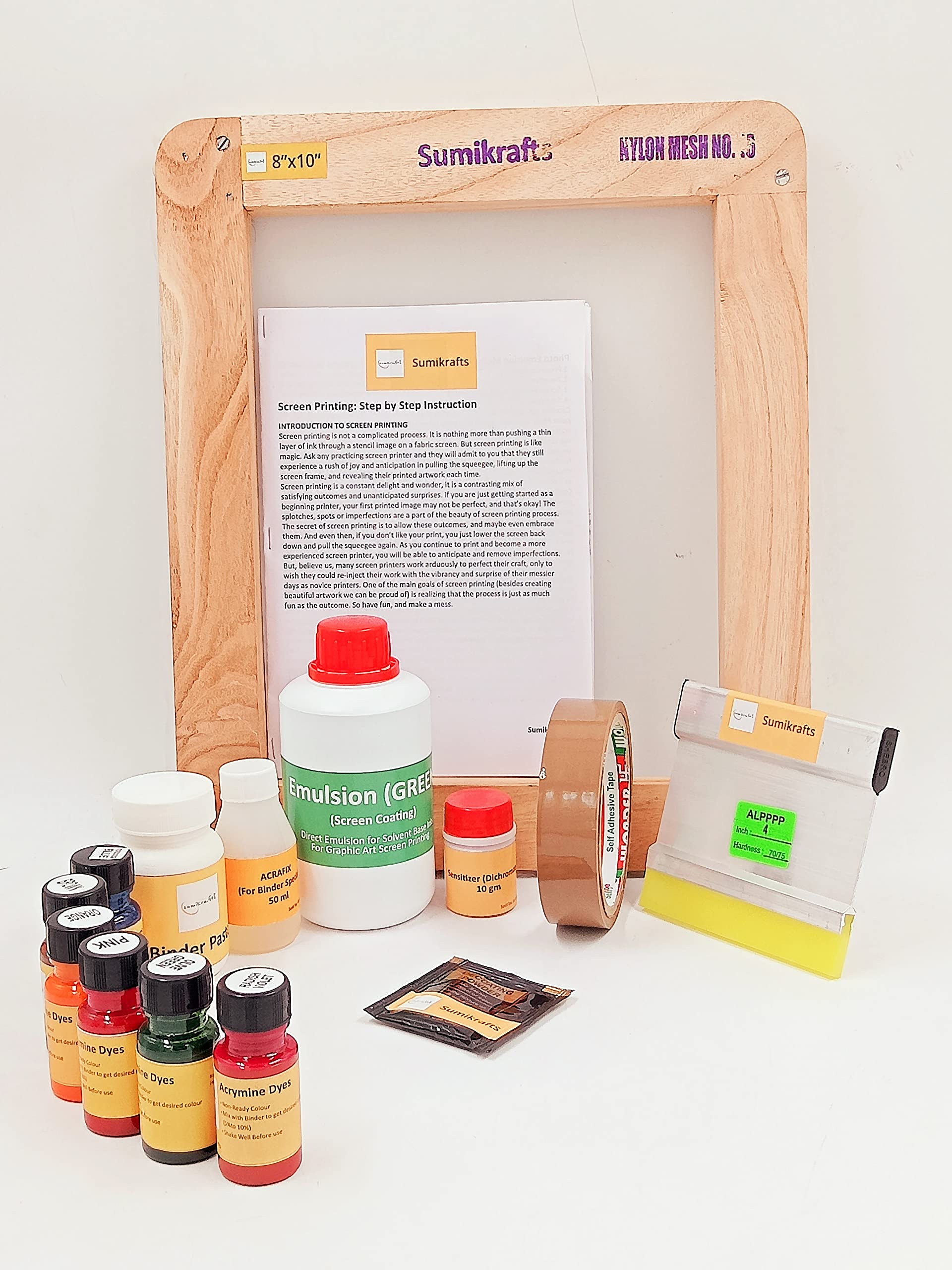 Sumikrafts Screen Printing Kit For Beginners Wooden Frame Small 8 X10 Pre Stretched Mesh No 16 6 Assorted Pigment Dyes Option 3 Amazon In Home Kitchen